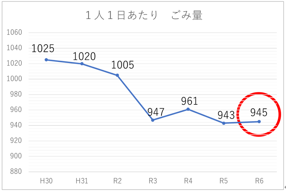 令和6年度の1人あたりの1日に出すごみの量は、945gだったのだ。