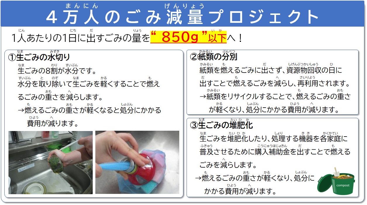 島原市は「4万人のごみ減量プロジェクト」で1人あたりの1日に出すごみの重さを850g以下にすることを目標としているのだ。