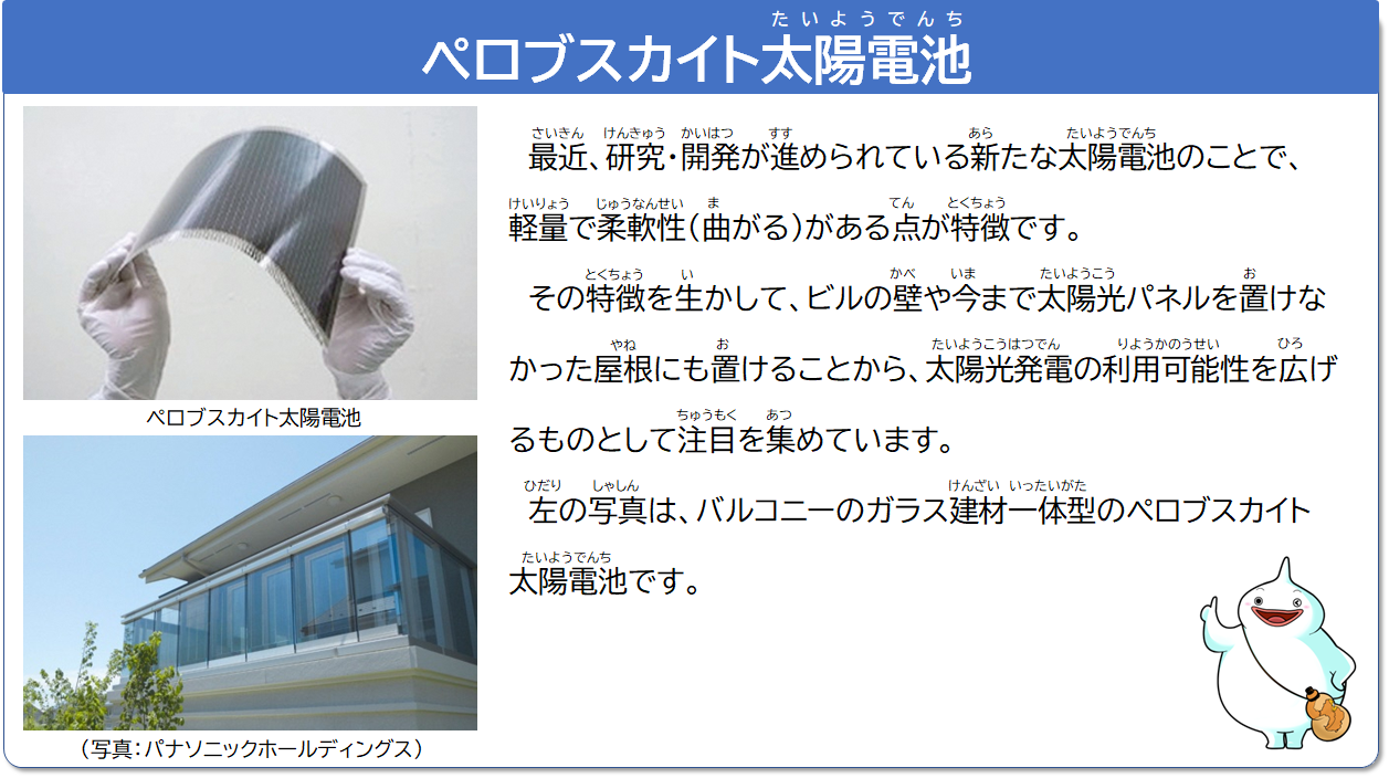 いままでの太陽光パネルは屋根や地面にしか付けられなかったけど、まげられるペロブスカイト太陽電池などが出てきたので建物の壁や窓にも太陽光パネルが付けれるようになるのだ。