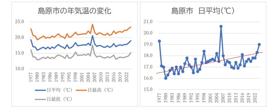 島原市の平均気温は下のグラフのように年々高くなってきています。