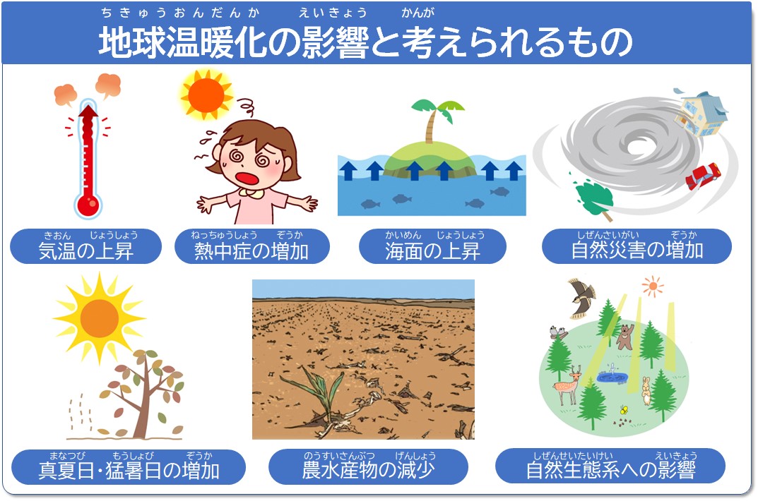 地球温暖化が進むと、私たちの生活にいろいろな困ったことが起こるよ。