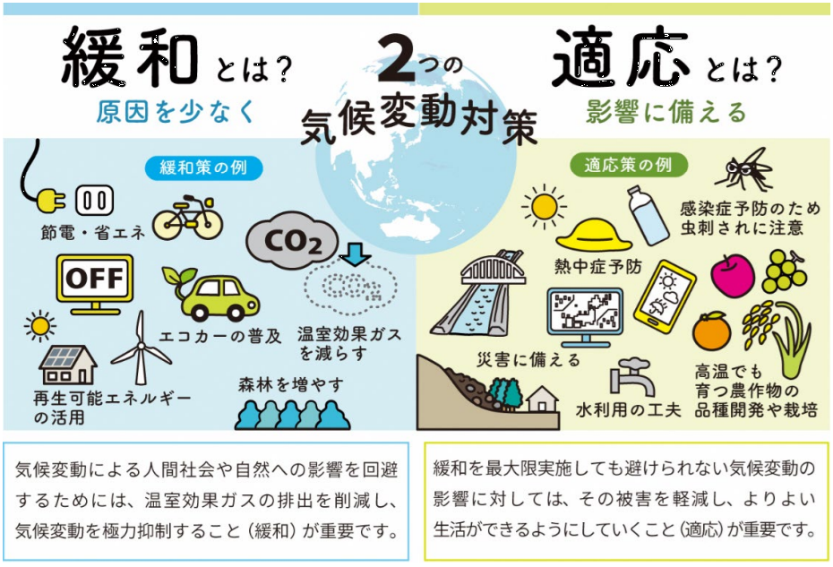 「緩和」は温室効果ガスを減らす取り組み、「適応」は気候変動の影響を軽減する取り組みなのだ。