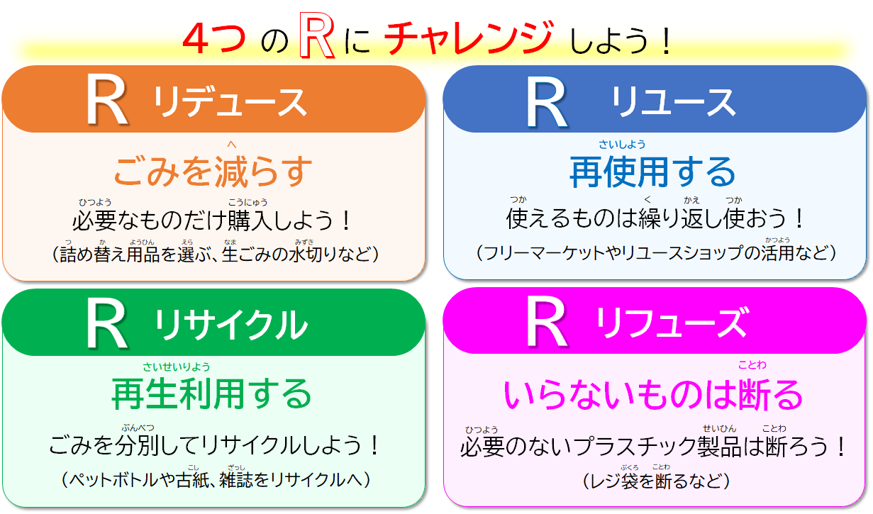 市の環境課では、リデュース(Reduce)、リユース(Reuse)、リサイクル(Recycle)、リフューズ(Refuse)の4つのRに取り組んでもらうように市民の皆さまにお知らせやお願いをしているのだ。
